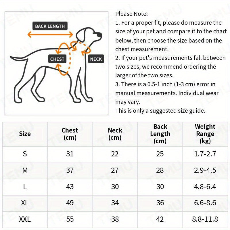 Măsoară lungimea spatelui (de la baza gâtului la baza cozii) și circumferința pieptului. Dacă animăluțul tău este între mărimi sau are blana foarte deasă, alege o mărime mai mare pentru confort.