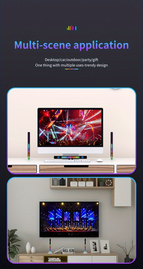 Transformă biroul, mașina sau camera într-un spectacol vizual dinamic. Microfonul integrat sincronizează luminile perfect cu sunetul ambiental.